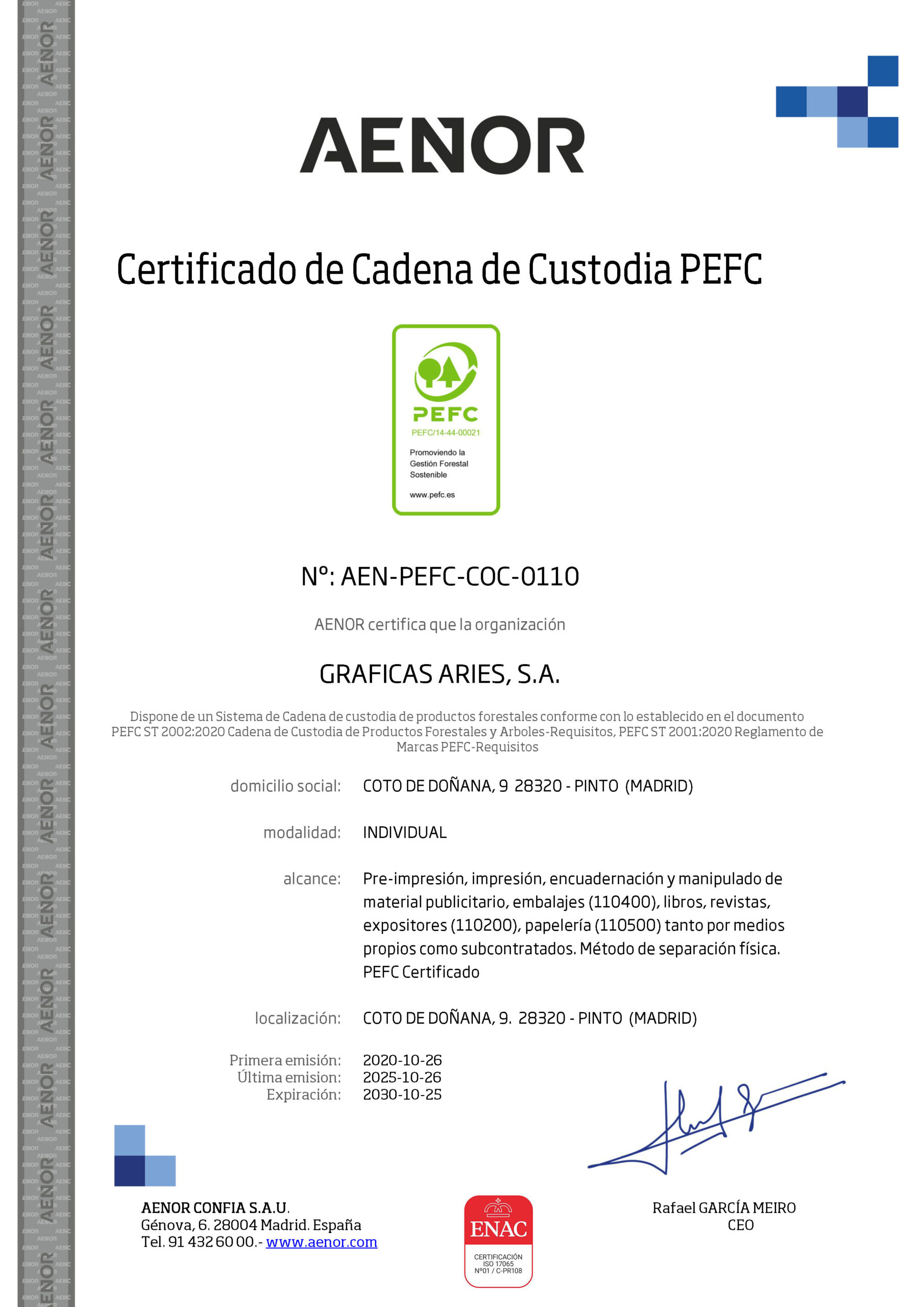 Por ello, aplicamos voluntariamente criterios de norma ISO 14001 de Gestión Ambiental y asumimos nuestro compromiso con la correcta gestión forestal, cumpliendo con los requisitos de la cadena de custodia marcados por FSC™ (FSC-C105569) y PEFC (PEFC/14-38-00096).